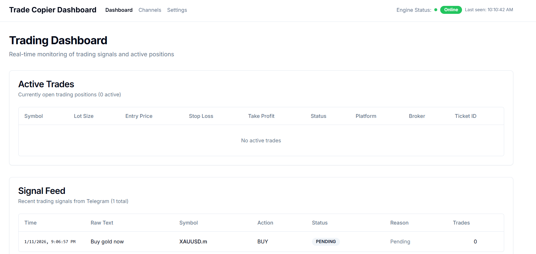 An automated desktop application that parses trade signals from Telegram and executes them instantly on the cTrader platform. Ensures < 100ms latency for high-frequency execution.